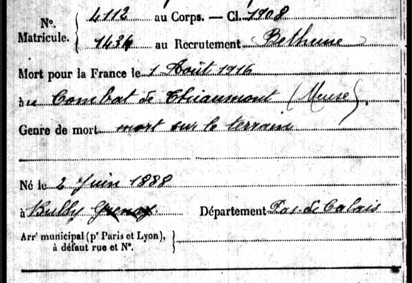 Né en1888 à Bully-les-Mines, il effectue son service militaire au 130e régiment d’infanterie comme deuxième classe. Durant le conflit, il a pour mission de porter les plis urgents aux différents officiers responsables des opérations militaires.