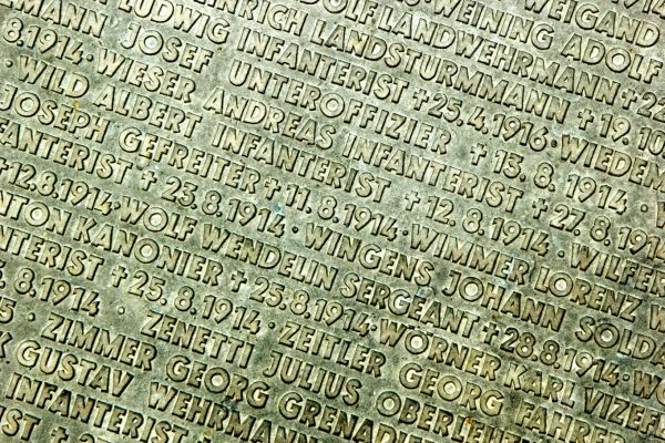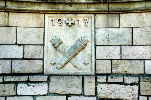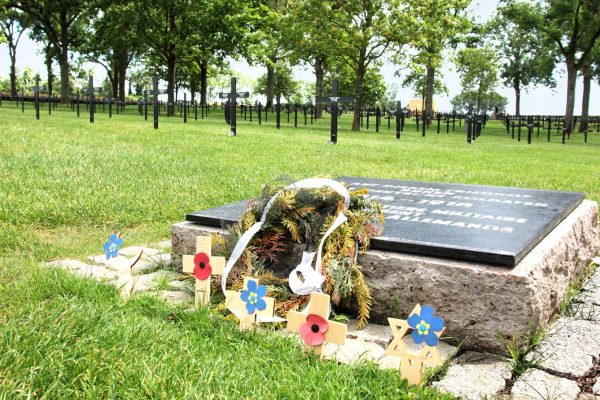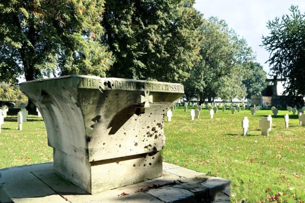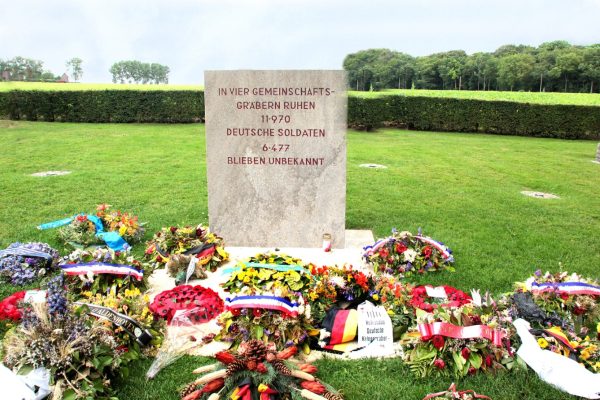 C’est la raison pour laquelle on trouve dans le centre de la nécropole, en mémoire des hommes amis ou ennemis tués au combat, un monument avec trois stèles, une avec un casque Adrian pour les Français, un Stahlhelm pour les Allemands, un Brodie pour les soldats de l’Empire britannique.