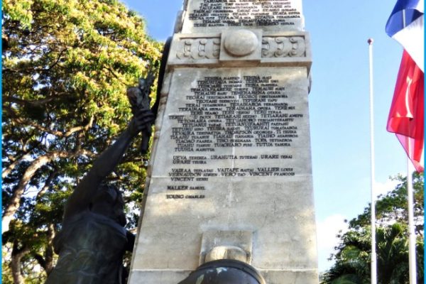 Le 14 juillet 1923, la Polynésie française honore ses combattants tués sur les champs de bataille français en inaugurant son monumental Monument aux Morts. Nous apprenons que ce monument a été commandé en Métropole, sur catalogue, au statuaire Galy. Il a été réalisé en France et livré par bateau en pièces détachées. C’est une vahiné qui a servi de modèle. Fleur de tiaré posée dans ses cheveux, elle offre un bouquet de fleurs – roses rouges et camélias blancs – au soldat. Tous les emblèmes de la nation et du patriotisme sont représentés : les couronnes de fleurs, le rameau d’olivier, le casque Adrian et surtout tout en haut…le coq gaulois. En 1933, un coffret contenant de la terre de Verdun arrive à Papeete « …en souvenir des combats où s’illustrèrent et périrent nombre de Tahitiens aux côtés de leurs frères français ». Cette terre a été déposée symboliquement dans une urne de bronze coiffée du rameau d’olivier, aux pieds du monument pour honorer la mémoire des Poilus tahitiens « morts pour la France ».