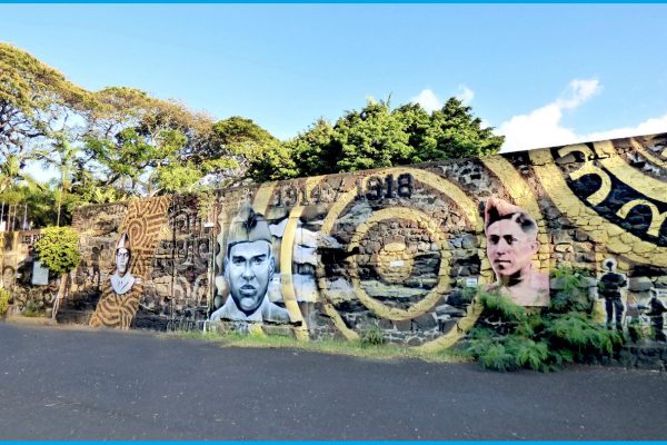 Enfin, le 11 novembre 2018, dans le cadre des célébrations du centenaire de l’Armistice, le Gouvernement de la Polynésie française a décidé de célébrer l’engagement et l’implication de la population polynésienne. Pour ce faire, une œuvre grandiose a été commandée auprès de jeunes artistes locaux afin d’honorer le dévouement de ceux partis combattre pour la liberté et pour la France, en des terres que certains n’avaient jamais encore foulées. Le mur, sur lequel a été réalisée l’œuvre, n’est autre qu’un vestige d’un bâtiment où, dès 1914, les premiers conscrits et volontaires sont passés avant d’embarquer pour l’Europe.