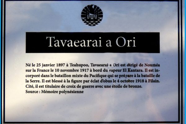 En déambulant dans les rues de Papeete, Guy VIEVILLE a constaté que la Grande Guerre n’a pas épargné cette île enchanteresse distante de près de 15 000 kilomètres de la Métropole. Vestige, monument ou encore œuvre font référence à cette période pour laquelle plus de 1 100 Polynésiens ont laissé derrière eux soleil et sable chaud pour venir combattre sur nos terres boueuses. En rentrant au pays en juin 1919, plus de 250 combattants manquaient à l’appel, « Morts pour la France », soit un pourcentage dramatique et conséquent de 22% de tués ou disparus. Il vous présente, photographies à l’appui, les trois sites qu’il a découverts au gré de ses balades.
